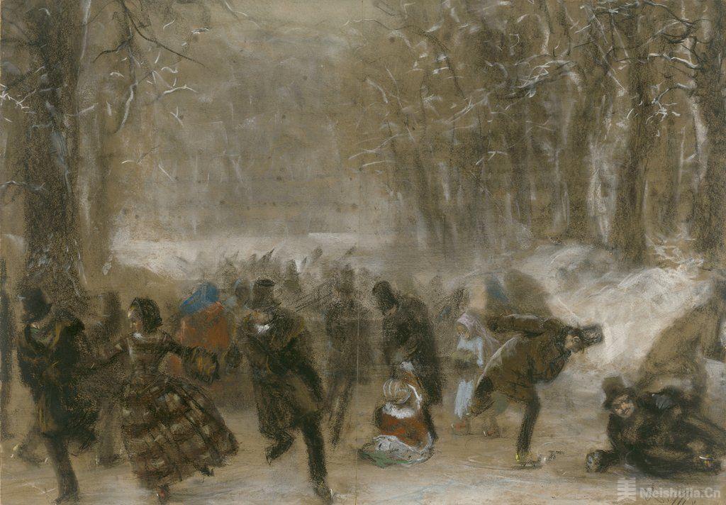 研究表明,一位德国私人收藏家在1955年购买了《溜冰者》,在之后的半个多世纪里从未进入公众视野。2018年,版画素描博物馆以32.5万欧元在拍卖会上竞得这件作品,之后对其进行了检查和修复。修复前的画作照片、修复后的画作和创作草稿将并列展出,以此帮助参观者更深入地了解 Menzel 的艺术创作。