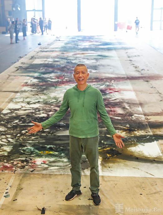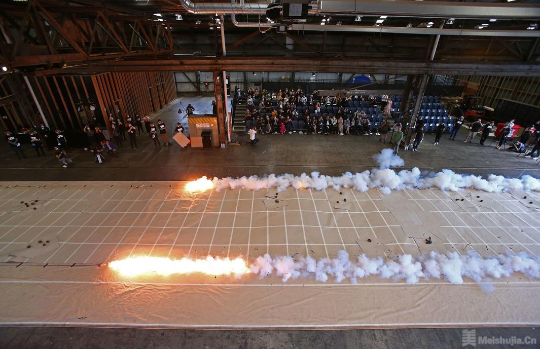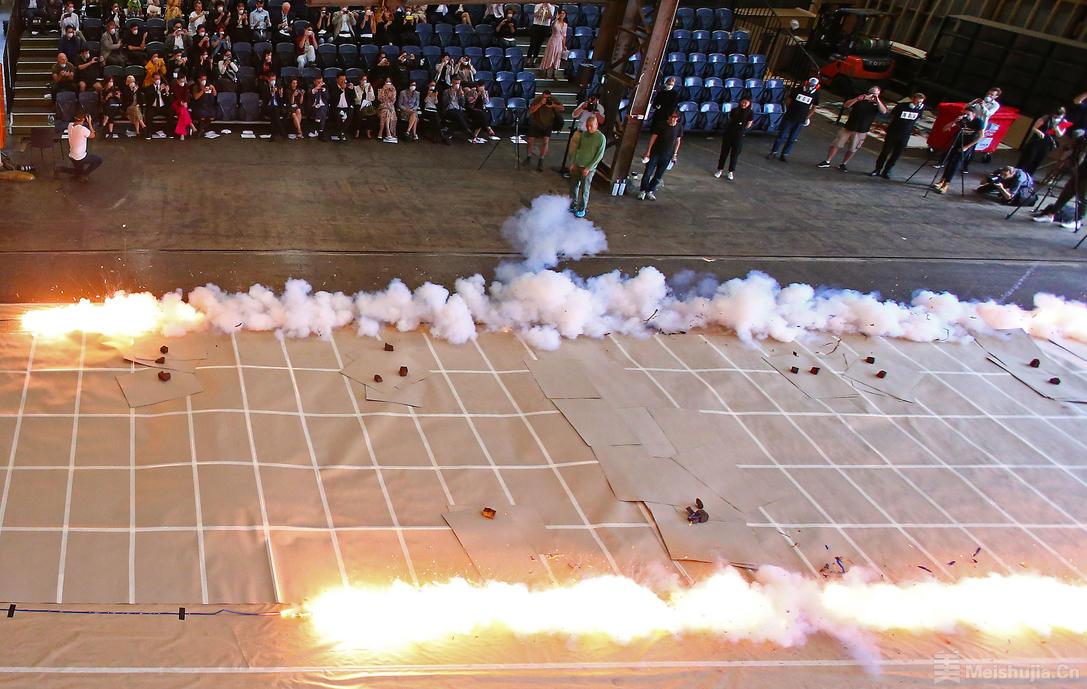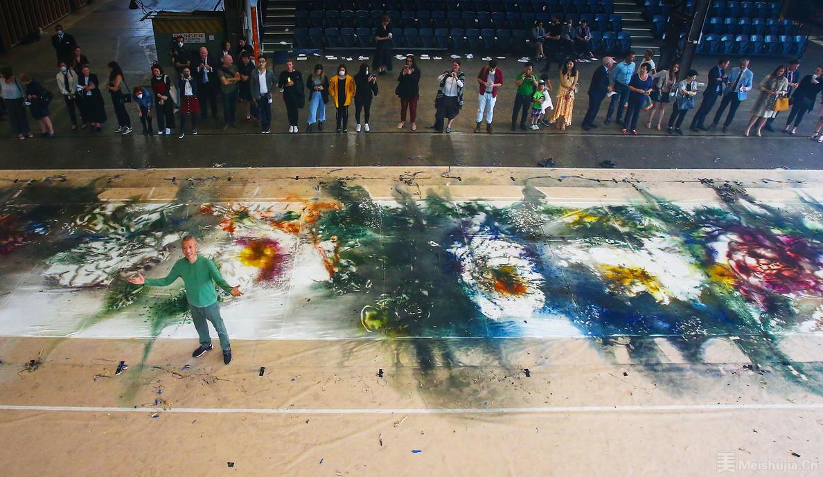 今日,全球最具活力的当代艺术家之一蔡国强,在墨尔本进行了一 场极具爆发力的艺术展示——现场创作火药画《花瞬 II》Transience II (Peony)。这幅31米长的火药画,是墨尔本冬季杰作展中三幅作品里的最大一件。展览将于2019年5月24日在维多利亚国立美术馆(NGV)国际馆开幕。