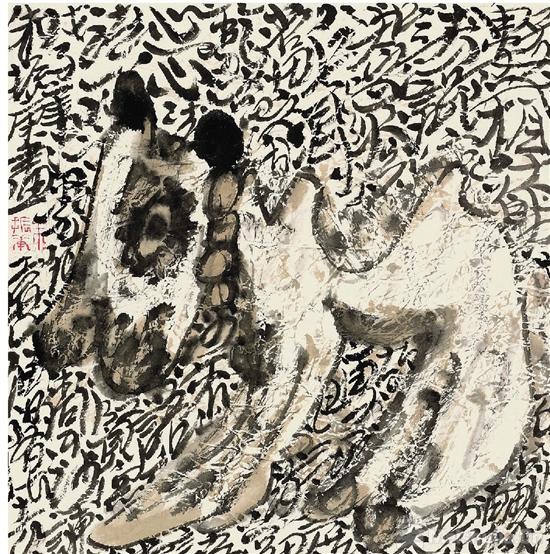 观朱振庚先生的作品,能感受到其作品鲜活的写意性,画面肌理是“活”的,是“写”出来的。他对“粉”的运用是独门技艺,在传统水墨画中,“粉”是极其慎用的,因为容易让画面俗气,但他用“粉”则画出了高格调。他还大量使用朱磦、朱砂、石青、石绿等配色,形成一种响亮的画面效果,成功地把中国民间艺术元素转换为现代绘画语言。其重彩作品具有古代壁画丰富斑驳的视觉效果,充满了质朴与博大的厚重感。在20世纪90年代形成个人独特画风后,朱振庚不囿于己,2007年-2009年再次变法,从每天日课的书法中获得新的语言方式,寻求一种更为接近水墨本质的创作方法,以书写性带入画面,书写更具备瞬间性,他以不可辨识,但畅快淋漓的书写作为画面主体的背景,创造出这种文与图的若即若离的空间关系,作为间隔、作为停顿或作为思考,形成了有意味的形式。这也是他成为了一个极为成熟艺术家的标志。