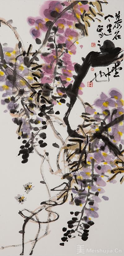 藤花垂露,雨洗清荷,古松涛吼,花丛蛱蝶曼舞,枝头小鸟掠过…此刻我正静心地、舒适地在丁建中的花鸟画作品中,领略着他作品与自然对接的一派生机,四时风光。