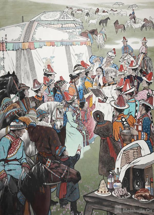 王万成多少年都秉持着平等的身份、平和的心态、平视的眼光全身心地拥抱对象,才有了如鲠在喉、不吐不快的创作冲动,也是他数十年乐于不避反复地演释藏族绘画主题并且取得骄人业绩的缘由所在。正是心灵契合、情感与想象、创造的叠加效应,才是成就了万成笔下如《曙光》《雪域欢歌》《风和》《朝圣路上》等一系列优秀大型人物画作品的必然动因。创作于2019年的水墨人物画《铃声摇响丰收歌》是入选第十三届全国美术作品展览的优秀获奖作品,他采用中西兼容的线条勾勒和多遍肤色罩染,使人物形象栩栩如生、质朴而富有生气,使其作品强化了画面的形式张力,突显了绘画艺术礼赞生命之隽永、吟诵精神之高华的内涵容量。