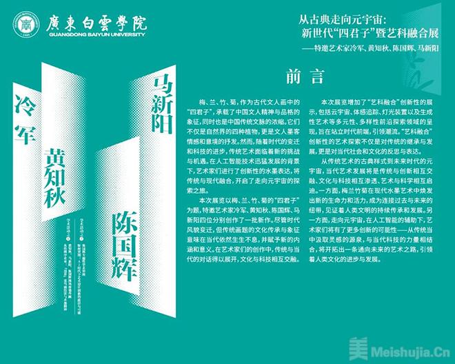本次展览以梅、兰、竹、菊的“四君子”为题,特邀艺术家冷军、黄知秋、陈国辉、马新阳四位分别创作了一批新作。尽管时代风貌变迁,但传统画题的文化传承与象征意味在当代依然生生不息,并赋予新的内涵和意义。在艺术家们的创作中,传统与当代的对话得以展开,文化与科技相互交融。