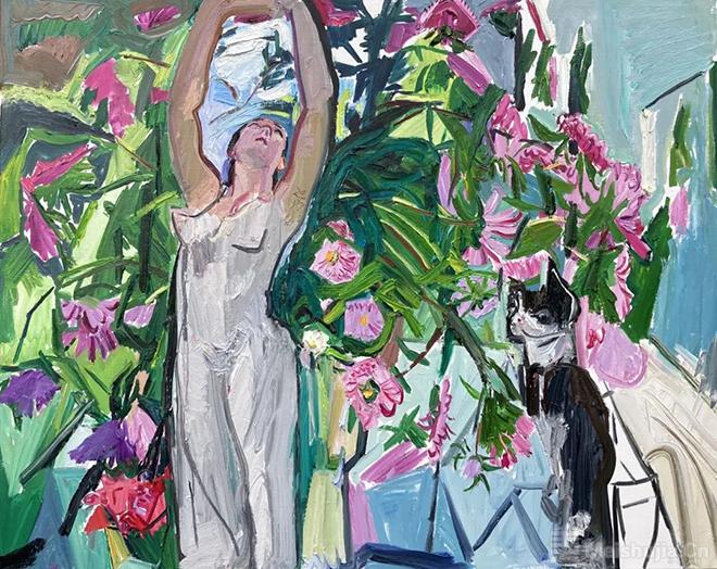 鱼儿的腥》《那一刻我很爱你》《给我些力量》《那些芳甸与花林》……细细品读她的画作,就会发现更多有意思的细节:藏在枝叶间的情侣伸向爱人的双手和彼此拥抱的身体,小猪佩奇轻盈欢快的共舞,少女和黑猫出神的十分钟对视,还有闫老师的下一代、下下一代……道不尽痴恋的千回百转,说不完迷蒙的青葱芳华。