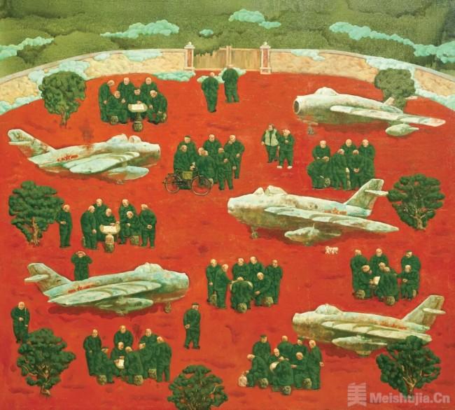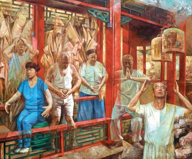 步入90年代,李占卿开始关注现实题材,艺术家特殊的成长经历和改革开放后中华大地上蓬勃昂扬的生活气息催生了《红土地》系列和《长廊》系列的创作。1990年,李占卿创作的一件反映“退休老干部”休闲生活场景的《午后的门球赛》入选第二届中国体育美术展,从此一发而不可收,《红土地》系列让李占卿保持了20年的创作激情,这背后是他对现实生活的倾诉和血液中红色基因的流淌。而在《长廊》系列中,他把晨练这一独特现象和中国传统的建筑元素——“长廊”重构在一起,表现了当时人们在精神追求方面的多元选择与困惑。从时间线索上面,我们发现《红土地》系列和《长廊》系列几乎是一个平行的创作期,它们在创作上交织在一起,彼此相通互补,从而扩大了作品内容的外延。李占卿通过现实主义题材的表达,再现了这一时期特定人群的精神状态,《红土地》系列和《长廊》系列作品不仅仅在全国的重要展览中屡屡展出、获奖,同时也标志着李占卿艺术创作迈向了成熟。