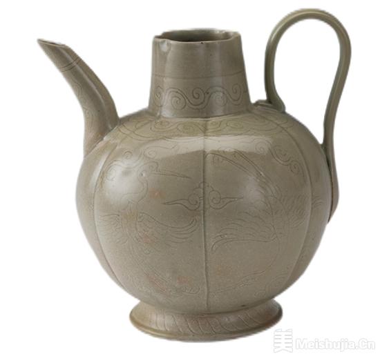 (2/6)越窑青釉划花双鹤纹瓜棱瓷执壶,五代十国吴越