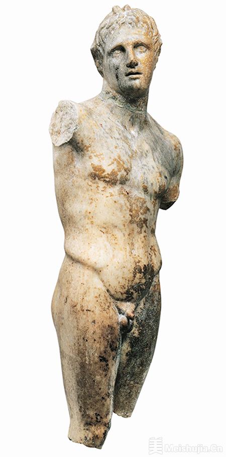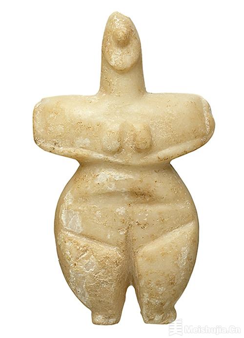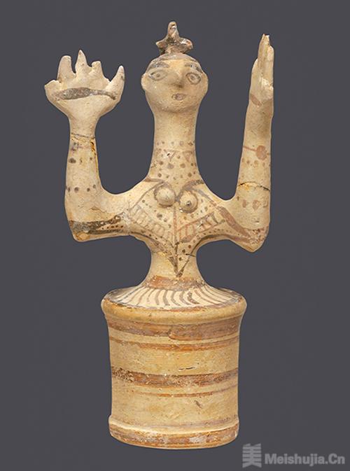 展览首先以新石器时代为起点,介绍基克拉泽斯、米诺斯和迈锡尼三个青铜时代文明。这一部分的亮点展品包括一件埃吉纳岛出土的女人像,历史可追溯至公元前5300-前4800年。雕像塑造站立的女性形象,双臂交叉放在胸前,臀部硕大,推测用于与生育和母亲女神崇拜仪式有关的场合。