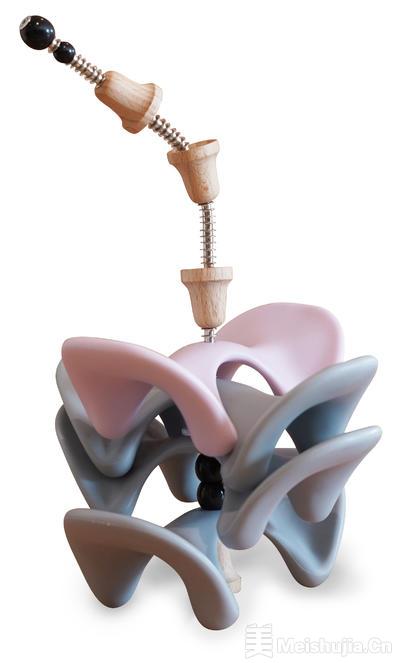 另从绘画延伸而出装置作品,龚宝棱将文具、生活等用品重新编制,像是《样品:填空》使用活页夹、手工纸、高尔夫球、假发片、贴纸等拼组于油毡板上;《Twins》用到的蓝色防撞泡绵常见于首尔汽车的车门上;《A-side》、《B-side》主要材料是将按摩用的橡胶物迭成脊椎般的意象;《收纳盒》利用毛边质地的球拍握把布装饰框边等,这些作品的尺幅大小就像书本、A4文件一般便利、轻盈。不同于过往的空间装置取材,多从扭转物件原先的功能性出发,这次的装置作品则是开展物件本身潜在的绘画质地,经过艺术家的拣选和对话关系,创作出抽象性的“绘画装置”。