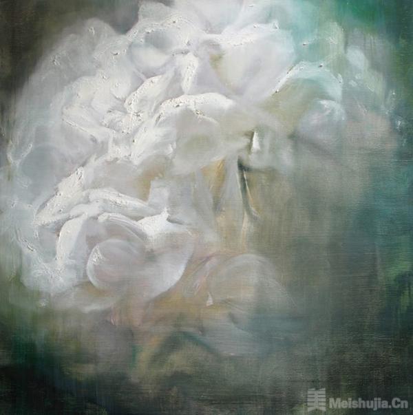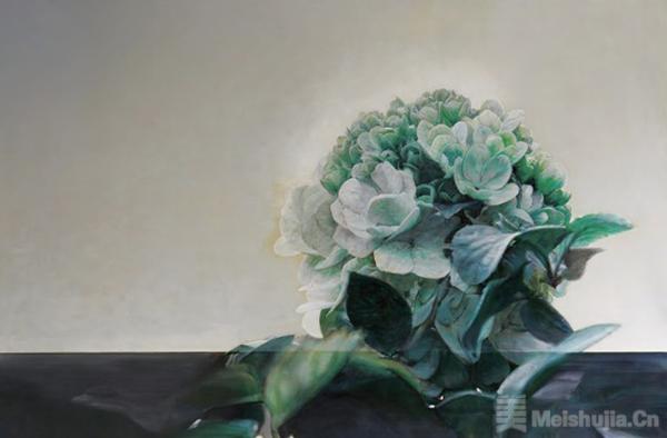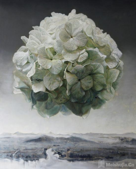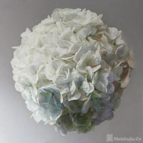 白色的绣球花,于我是一种象征:绚烂之极归于平淡,她有着白玉一般的美,外表平静,内涵辉光。宗白华先生的美学思想给了我很多启发,“意境是艺术家的独创,是从他最深的‘心源’和‘造化’接触时突然的领悟和震动中诞生的,它不是一味客观地描绘”。2015年始,我几乎每年会画一两幅绣球花。那些白色的绣球花,或团簇于瓶,或散放在盏,置于桌几。鲜花瞬间的绽放绮丽,与陶瓷木器、窗棂楼阁的岁月凝滞,对峙中隐隐相偕。极致的写实,叠加东方的意境,我尝试着追求东西美学的偶遇天成。
