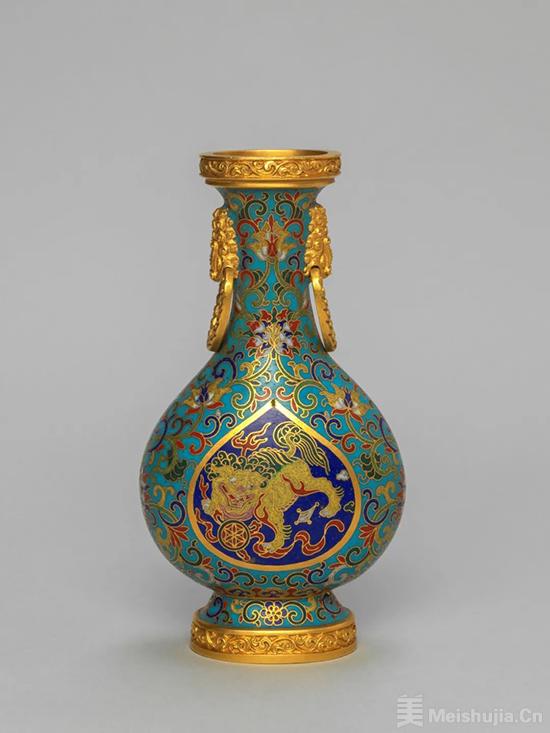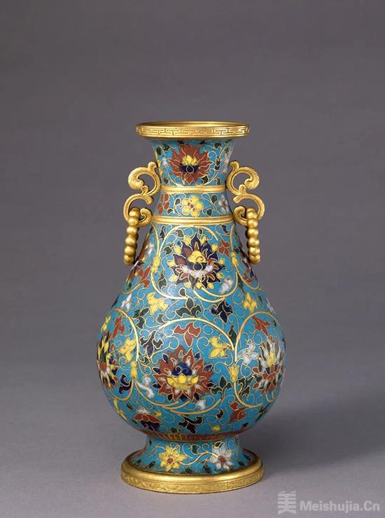 元代掐丝珐琅器造型曲度舒适,花纹装饰以缠枝莲纹为主,明代掐丝珐琅器装饰题材明显多样化,出现了龙凤、狮戏、花果等纹饰,并且开辟了在器物上署皇家款识的先河。至清代康熙、乾隆时期,掐丝珐琅器不仅制造量远超前代,体量之硕大、功能之丰富更是前所未有。