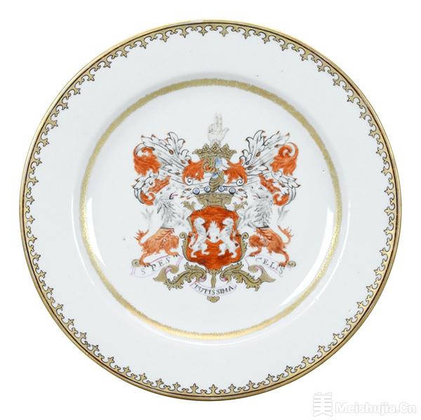 (3/6)青花矾红描金纹章纹浅瓷盘,清乾隆
