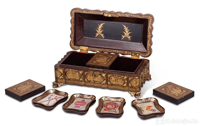 (4/6)黑漆描金人物故事图游戏盒,清代