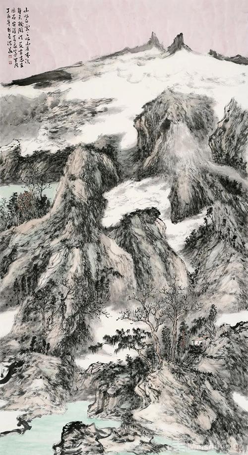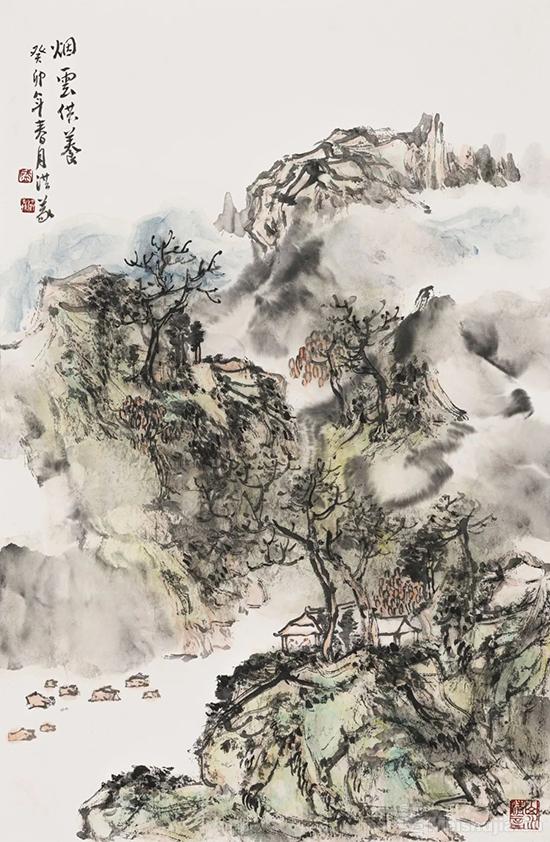 洪义兄的作品最打动人的是扎根生活的厚重。沂蒙山水的灵秀、军旅生涯的刚健,都化作他笔墨的底色。笔下山水如《近山生云烟》,墨色藏着浮来山晨雾的湿润,线条带着蒙山岩石的筋骨,刚柔相济间尽显文人情怀与军人赤诚。早年同写生时,他总说"山水有魂,得先懂它的筋骨",这份敬畏早已融入创作。