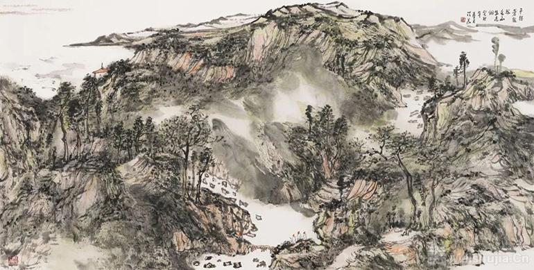 就艺术家个人来讲,他首先是一个社会的人,其次才是艺术家。应该是“开门见山”,关门画山,而不是关门造山,“开门无山”。如关上门搞艺术,这样的艺术就没有生命力。盛洪义就属于“开门见山”型的艺术家,他把艺术和人生紧紧地相扣在一起,并且在艺术上有自己卓越的表现。盛洪义的山水画画得非常好。他早期画人物画,在中央美院深造时,画的一批线描人物颇得行家好评。盛洪义有敏锐的艺术感觉,这种艺术感觉是先天的,但更多的是后天的磨炼。他从同行和前辈画家中,汲取营养,他的山水画比较细腻、比较扎实、比较耐看,他的画雅俗共赏,行家和老百姓都能接受,都能看得进去,能够产生共鸣。