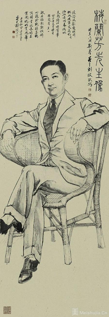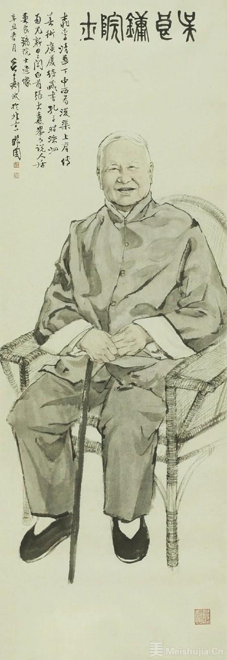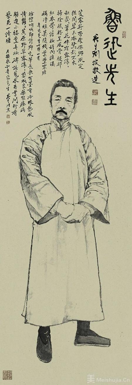 所绘肖像都是真人大小,把一切说明性的背景和道具全部抽离,完全用人物自身的神情和动作来表达。给自己最小的表现空间,也就把自己放置在一个相对困难的境况中,其难可想。要从很多照片中揣摩大师们的风范和动作,必须在公众耳熟能详的形象中,达到“这一个”的独特品质,很需要下一番功夫。题赞亦因人而异,有长歌、绝句、律诗、词甚至曲等,用不同书体题写,把大师们的道德文章贴切、精炼地彰显出来,清新俊逸,不落俗套,更可见其古典修养之一斑。
