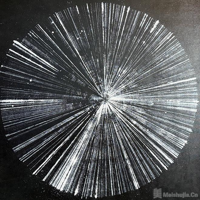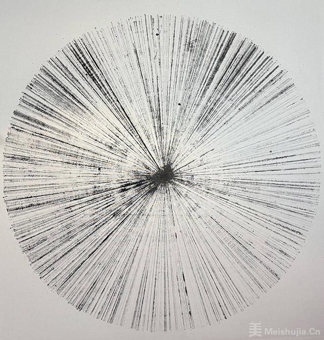 元素之二是他画作中使用的木棍。这些木棍是一位艺术家在离开他们相识的艺术驻留地时送给他的——整个系列作品都是在那里创作的——斯沃琪和平饭店艺术中心。在中国文化中,木棍有着特殊的含义,除了可以作为筷子日常使用,还与祖先的材料传统相联系。这一元素催生了一系列基于动作重复的图形绘画。鉴于他作为版画家和打击乐手的背景,这种融合将节奏转化为图像。