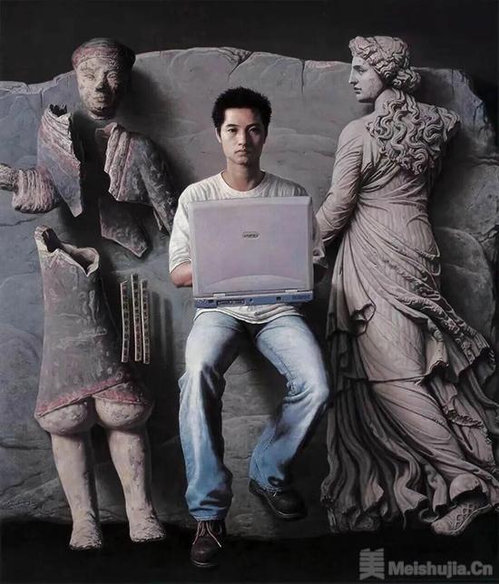 在展出的油画作品中,既有《拿戒指的女孩》《女儿》《凝》等早期具象写实佳作,亦有《山海经》《痕迹》系列等融合东方意象的当代探索。与此同时,顾致农在水墨领域的实践同样令人瞩目。《跳绳的人》《梦山》《玉兰》《山林间》等水墨作品,展现出他对线条与留白的深刻理解;而《如梦》《道德经八十一章》等书法作品,则将书写性转化为画面中隐忍而有力的精神脉络。