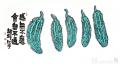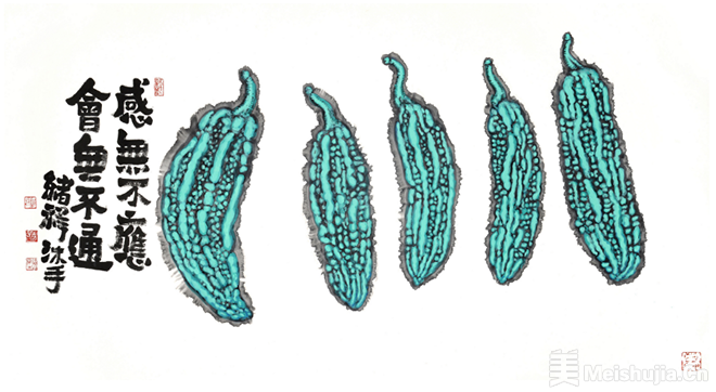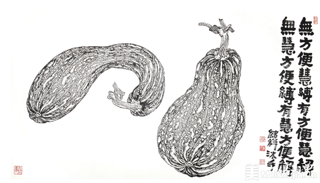 唐绪祥具有掌控水墨纸张等传统画材的高超能力,并将传统绘画中以诗书画印来经营位置的形式特质精准呈现。其画作的最妙之处在于墨与色的使用布置:山水重墨,在浓与淡中成就层次分明的山石树屋。尤其喜欢以重墨为山造型,呈现为浓黑的面;以淡墨勾出楼阁花树,呈现为清淡有序的线;又在水墨的洇渗中,融合出既有强烈对比而又柔和统一的黑白灰关系,真正做到墨分五色;偶以石绿染树、赭红着墙,由粉绿砖红点缀黑白灰的纯粹,因此更添缤纷趣味。蔬果重色,往往是墨线为廓,以斑斓重彩染就画中果蔬。其惯用粉绿、玫红和浓重的黄,在客观自然的基础上,恣意夸张。咧嘴的石榴、斑驳的苦瓜、茄子青椒、青红萝卜等,都处理得多彩炫目。画中图文互补,多以大字点题并填充空白,字形质朴方拙,金石意味浓厚,因此更具装饰意味。唐绪祥曾师从李可染、白雪石、张仃诸先生研习山水绘事,又深耕金工数载,这让他的绘画作品既有传统绘画的笔墨精神,又呈现出深厚的工艺美术功底,成为当代艺术家重新阐释传统艺术的一个典型案例。