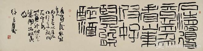 常言道:“士隔三日,当刮目相看。”徐涛君诚为此士也。近年他尤着力于大篆研习。焦黑浓重的墨线仿佛刻划进纸面,又像商周青铜器铭上那浮起的阳文线条,真是具有强烈的金属感和金石气。他以行草笔意参化金文大篆与汉篆殳书,雍容疏放,古奥奇曲,一如凸凹有致的印面文字,令人称奇。徐涛君之行草完成了从碑学向帖学的华丽转身。我曾见其临写的《唐人摹万岁通天帖》的王氏一门书,颇具东晋风度。而近期其行草,气息古雅内敛,潇洒从容,更获精进,毫无一点碑派书家在点线上的滞涩和造作。