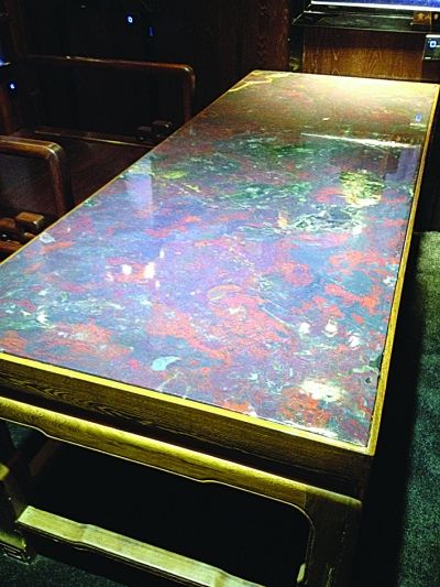 扬子晚报记者昨天一进入VIP区,就被一张茶几吓到了。这是一块完整的鸡血石制作的,据说有200多公斤重,长185厘米,宽72厘米,厚8厘米,四周用木头进行了封框,下面配的是同长宽的木头茶几,据称这种整张的鸡血石,国内市场上只有2块。扬子晚报记者看到,鸡血石上油光闪亮的,上前摸一下,原来是被桂花油“养”着的。据了解,这是店方数年前从内蒙巴林收回来的,不仅得来有一段故事,就连运到南京也着实费了不少劲。