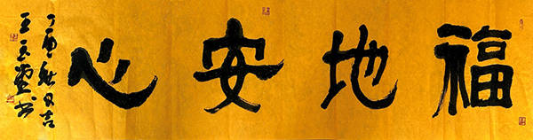 这幅作品采用隶书章法:“不忘初心”四字,笔势连贯如一气呵成,“初”字侧锋起笔,如利刃破纸,却在收笔处轻转圆融,暗合“初心本纯”之意:“心”字三点如星,牵丝连向末笔,似有“初心绵延”之象。“为了人民”四字,结体方正稳重,笔画粗壮如柱,尤其“民”字末笔斜捺舒展开张,如广厦庇荫,直观呼应“人民”二字的分量。