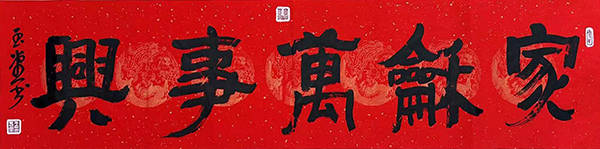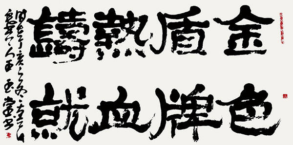 其隶书创作,可见深厚的碑学功底。他临习《曹全碑》的秀逸、《张迁碑》的厚重、《乙瑛碑》的端庄,却不困于古人法度。观其隶书作品,结体方正中藏巧变,横画舒展如翼却不失筋骨,竖画挺拔似松而暗藏弹性。他尤其善用“隶变”之法,将篆书的圆转意趣融入隶书的方折笔画,使线条在“方”与“圆”的交替中生出韵律感。墨法上,他不刻意追求浓淡对比,却以自然的枯润变化营造层次——起笔时饱蘸浓墨,行至中段渐显干涩,收笔处又轻顿回锋,墨色如古玉包浆般温润,既保留了隶书的古朴气质,又赋予其鲜活的生命力。