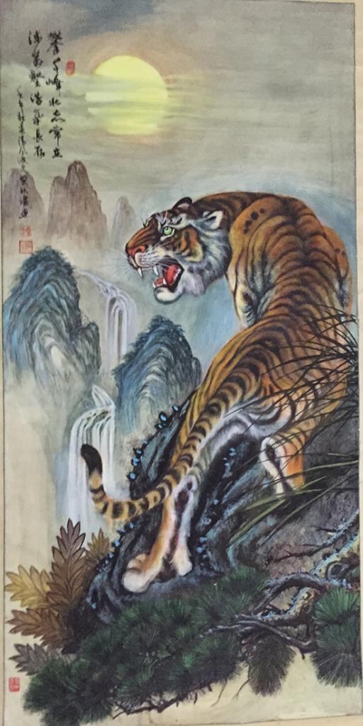 我画的《虎》。原系布本、粉画,后期转为纸本,纯属中国工笔画(也有半工半写的),大的达3米,横2米,曾存有湘乡检纪会会场,娄底民政局光荣院……所配景有山谷丘壑、幽涧奔泻、草丛悬崖、古松草莽,有草中曲身扬尾,眈眈虎视,长啸危岩巨石之上,声振空谷,若有回声。通畅以水墨设色而成,构图博大.气势雄浑.其背景极为