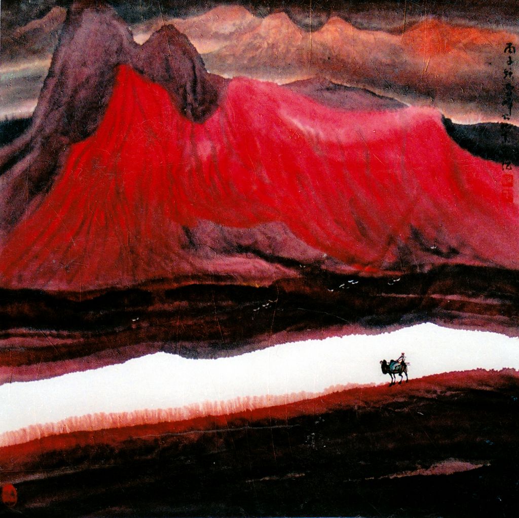 传统中国画经过千百年的发展已高度成熟。以笔墨为中心的水墨画的现代转化是个时代难题。所以当前中国画和古人相比,笔墨已很难超越;但是在结构意识、色彩的运用、观念的表达方面,都还有很大的空间可供挖掘。雪峰在这一点上是清楚的,他根据新疆的地理环境和人文景观,选择了重彩这一绘画艺术语言,使他的作品面貌为之一新。纵观绘画历史,中国艺术最早还是以色彩见长。祖国各地发现的史前岩画、新石器时期的彩陶,就是一个佐证。就中国画而言,唐代的金碧山水、宋代的青绿山水以及元代的浅绛山水,举世闻名的敦煌壁画、永乐宫壁画均以富丽堂皇的色彩见长。只是从宋元后随着文人画的兴起,水墨为上的观念才成了中国画发展的主流,明清时期达到了高峰。雪峰找到了他艺术创作的切入点,即避开了水墨为上的时代潮流,选择了中国画近现代发展的弱项,即写意色彩艺术的山水画表达模式。而这种手法能恰如其分地表现新疆独特的自然风貌和蕴含的风土人情。新疆有许多地方是雅丹地貌,色彩光怪陆离,特别是吐鲁番盆地四周赤裸的红岩宛如火焰般给人一种烘烤和炽烈的感觉。沙漠奇观,早霞、晚霞照射下的深邃而谲异的海市蜃楼般的视觉震憾、使人遐想、陶醉,极具艺术感染。这种独有的自然景观本身造就了和内地地理环境的很大区别,这本身就为艺术家提供了生活的源泉和艺术创作的契机。雪峰紧紧抓住这个命脉,勤奋探索耕耘20余年,逐步形成了自己强烈的艺术面貌。他以写意重彩为手法,以天山为载体,充分显示了与众不同的创作模式,即新疆重彩山水画艺术。他的红色运用得相当娴熟,既丰富又华丽典雅,可以和唐代工笔重彩仕女画相媲美,称得上是“雍容华贵”。他打破唐宋以来金碧山水、青绿山水、浅绛山水的传统画法,又不同于近现代的泼墨泼彩的画法,而是运用多层的“没骨法”,以彩代墨,完全用颜色写出来,再加稍许渲染。他完全打破了古人“墨不碍色,色不碍墨”的传统模式,作品通篇以色彩写出。虽然用墨打稿,但颜色以红为主调,色即是骨、又是肉、又是墨。这完全归结于他的才气与修养,他对色彩有一种超乎常人的敏感。在红色的运用中既非常微妙,又富有变化。细观其每幅作品,红色里有胭脂、曙红、大红、朱砂和朱膘,显得整幅画在大气醒目中,丰富多彩、色调饱满,极富视觉冲击力。