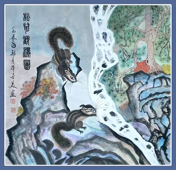 国画:松鼠观瀑图69x68cm(孤品)