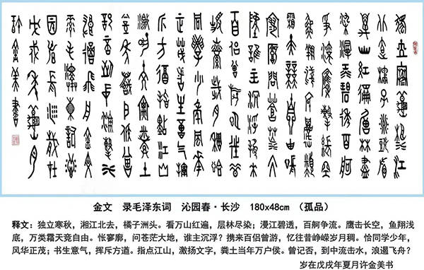 2024年,他被评为“亚洲书画界十大新闻人物”,“福布斯十大文化名人”,首席外交文艺家丶国之大家非遗传承示范人物和非遗中国书法传承师等荣誉称号,在国内外享有盛誉。近十多年来,他三十多次参加国内外书画大展赛,成果颇丰,荣获特等奖、金奖36项。其中国际特等奖2项、金奖3项;全国金奖、一等奖30项。2025年12月19日,我写的金文《毛泽东词沁园春雪》参加联合国举办的“地球生灵之美艺术展”荣获金奖。充分证明了他的书画艺术实力和影响力。许金美多才多艺,诗文书画全能,尤其是甲骨文书法独树一帜。他撰写的《怎样写甲骨文》和《甲骨文毛泽东诗词全集》,由中国美术出版社出版。2017年7月入编世界非物质文化遗产名录。他创作的《甲骨文三字经、千字文、弟子规、增广贤文》長卷近120米,以及正在创作的《老子德道经》長卷近80米,都是甲骨文书法领域的鸿篇巨制,令人震撼。这些作品为中国甲骨文书法的研究和传承作出了重要贡献。许金美创作的书画作品均为孤品,深受国内外单位、企业家和收藏家的喜爱。他的作品被联合国教科文组织、安阳殷墟博物馆、江西舒同博物馆、日本东京画院等31多个单位和企业家收藏。2024年8月,他创作的《中华甲骨文百家姓》300亇姓氏,由国宝档案展示。这充分展示了他在甲骨文领域的卓越成就。只有辛勤不断耕耘,才能结出丰硕之果。近年来,许金美在书画创作上由于成绩显著。2016年6月,中访网全媒体中心以“中国正能量艺术家一一许金美”;2020年11月,中国艺术研究会、中国名家画院以“国家巨星一一许金美”;2022年6月,中央电视台朝闻天下为献礼香港回归25周年,以“一代翘楚一一世界艺坛领军人物许金美’’;央视书画频道以“新时代艺术领袖许金美";焦点访谈人物以“世界文化艺术一代宗师许金美”;中国新闻联播以"国家艺术形象人物许金美”和中国主题巡展组委会以《中国文化人物》作为全国艺术家的代表等十二个频道分别作了专题报道,在国内外文艺界产生了巨大影响,为中外的文化艺术交流做出了巨大贡献。
