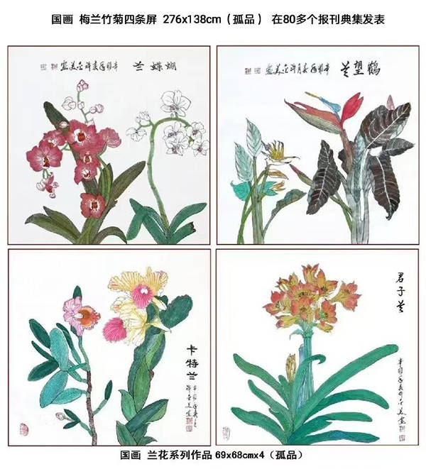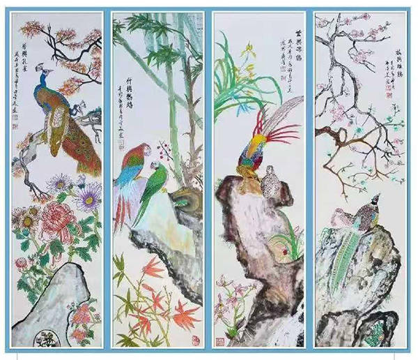 工笔画:梅兰竹菊四条屏276x138㎝。入编《中美建交37周年纪念册》