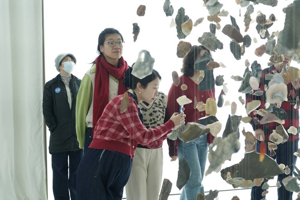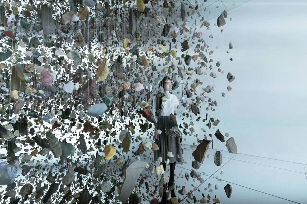 扎根大地的创作积淀转化为硬核品质——区别于常见的“拼盘展”,《能量宇宙》的作品原创率超80%,多数作品为本次展览特别创作。王爱君用2万余颗天然石块悬挂成阵,打造承载亿万年时间能量的《昆仑·深邃时间》;罗黛诗专为展览创作的《生长中》,见证铜在自然与人工干预下的能量转化;赵燕与朱剑非联合创作的《沧海桑田》,以全息沉浸技术打造“一眼万年”的视听盛宴。这些打破常规的艺术尝试,让晦涩的艺术概念变得可感可知,这也是它能收获大众喜爱、摘得“年度现场”的重要原因。