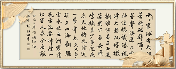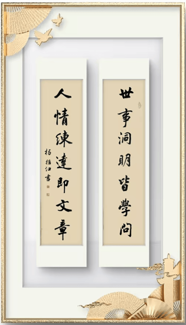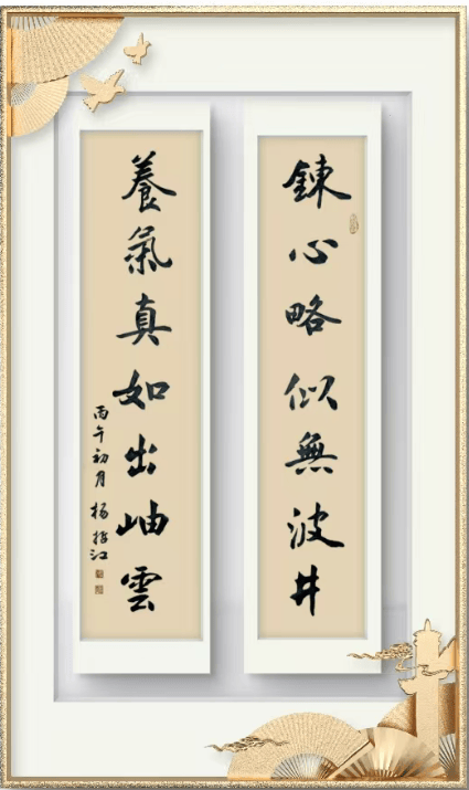 杨哲江幼承庭训,随父学书。先临欧、颜、柳,又学赵、米、王,并得到著名书法家欧阳中石,旭宇、邹德忠、卢中南等前辈的指教。中石先生对其作品的评价是:作品很美,布局严谨,笔法流畅,书卷气很浓,欣赏其作品有种美的享受。建议要在不失传统的情况下注重创新,并坚持发扬自己的风格。