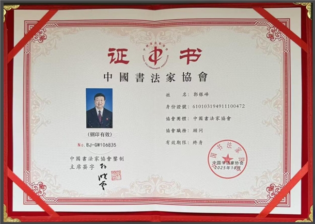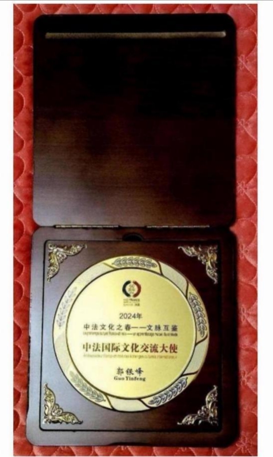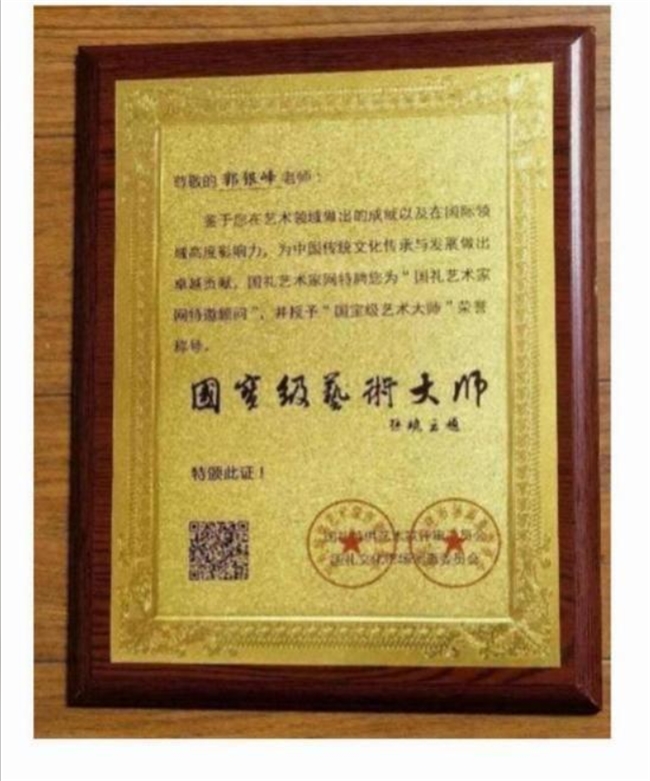 授予郭银峰“2023 年 度全球十大杰出风云”,“中国艺坛 2023 年度优秀艺 术家”,“威尼斯双年展——特别推荐艺术家”,文化和 旅游部授予“优秀书画导师”,“中国当代世界级艺术 家”,“一带一路文化形象大使”,“中国国礼特供艺术 家”。