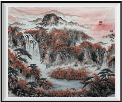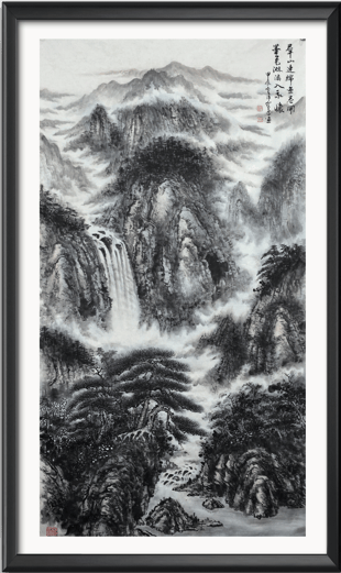 他的山水画以“浑厚中见灵秀”著称,善用积墨法营造山峦的厚重体量,又以淡墨擦染表现云水的空灵,如《秋山飞瀑图》中,巨石嶙峋与飞瀑流动形成张力,整体气势磅礴却细节丰富。他的牡丹作品《富贵吉祥》,则“艳丽中带清雅”,以色彩饱满、笔触奔放展现生命活力,却通过枝叶的墨色调配避免俗艳,透出文人画的含蓄品格。