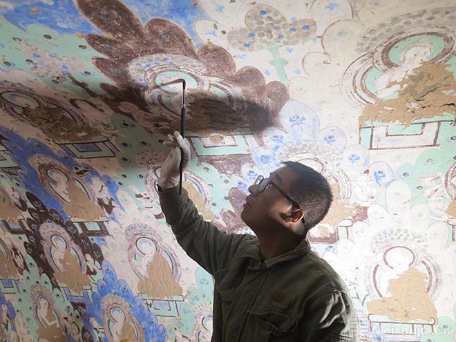 工作人员在给石窟壁画表面除尘 克孜尔石窟研究所供图