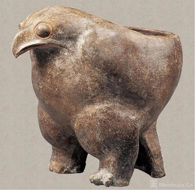 新石器时代是陶瓷雕塑的萌芽期。在黄河流域的裴李岗、仰韶、大汶口等遗址,均发现不少单纯的陶塑,比如塑人头像、人面、兽面及猪、狗、羊、鱼、鸟等动物;还有作为陶容器装饰的捏塑。其塑造手法原始,作品形态稚拙。甘肃大地湾遗址出土的少女人首形彩陶瓶、嘉兴大坟遗址出土的灰陶人首瓶等,则开启了器用与塑像的结合之路。陕西太平庄出土的黑陶鹰尊,矫健威猛,可谓仿生杰作。此外,山东泰安大汶口遗址出土的红陶兽形壶、浙江河姆渡文化的灰陶阳圈线仿生壶等,都是集实用与象征于一体的仿生佳作。新石器时代的匠人通过简练的雕塑语言,将原始信仰、日常生活与审美意识融为一体,塑造出大量朴拙高古的陶塑作品,成为早期中华先民精神世界的实物见证。