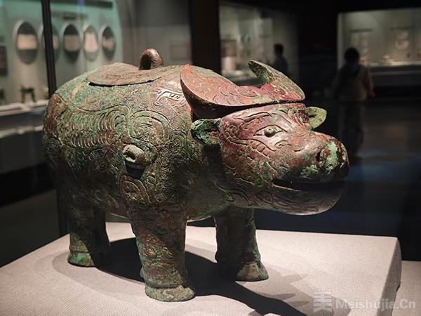 牛面部铸铭文“亚长”,亚长是商王朝南部“长”国的部落首领。这件青铜尊仿水牛制成,栩栩如生的造型体现出工匠对水牛特征把握的精准,也是当时殷墟气候的直接反映。更为重要的是,通体遍饰神性动物纹样的牛尊,不仅是一件祭礼的酒器,更是殷商时期人神沟通的媒介,担负着沟通天地的神圣职责。