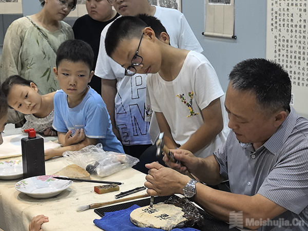 在众多实践探索中,非遗传承与乡土课堂的深度融合模式,成为泰安市美术馆乡村美育最亮眼的特色之一。美术馆深挖泰山石刻碑拓、民俗剪纸、泰山陶艺等非遗项目的美育价值,邀请非遗传承人以“驻校教师”身份走进乡村课堂,通过“沉浸式体验+手把手教学”的方式,让传统技艺成为滋养少儿心灵的活态教材。在泰山石刻碑拓课堂上,传承人不仅带来了微型碑石、拓包、宣纸等专业工具,也带着对泰山石刻历史文化的深刻理解,从碑石的年代背景、书法风格讲起,逐步演示清理碑面、裁剪宣纸、刷墨拓印等每一个关键步骤。孩子们围在传承人身边,屏息凝神地观察每一个动作,当第一张带着墨香的拓片从碑石上轻轻揭下,孩子们眼中闪烁着惊喜的光芒。这种将本土文化符号转化为可操作、可感知的艺术实践,让乡村少儿对家乡文化产生了强烈的认同感与自豪感。