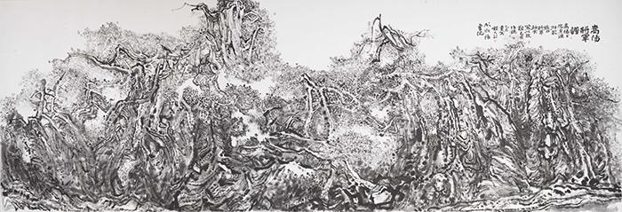 此次展出的山水作品,呈现着他在当代山水创作中的内力和定力。观其山水笔墨千万点,笔笔意味着茂叶繁枝生生,又若大河波光粼粼,更有高山泥泞道上的生命峥嵘,此刻画里墨迹尽在“一法遍含一切法”“笔笔往来天地生”的通达之中。他把一画一笔之法贯通人生之行,让每一笔、每一墨与形态浑然一体,在无形中品意象之在,在有形中感自然生命和谐,给人以豁然开朗之感。这是时代真善之美的绽放和映印。
