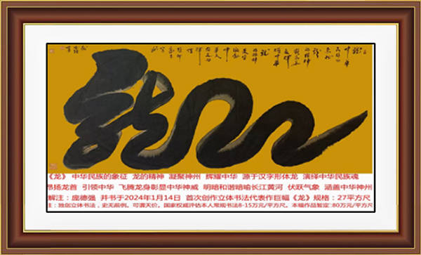 由以上五个方面因素决定了立体书法的经济价值。尤其是作为立体书法系列的代表作精品,首创八尺整宣巨幅《龙》,堪称旷世极品。