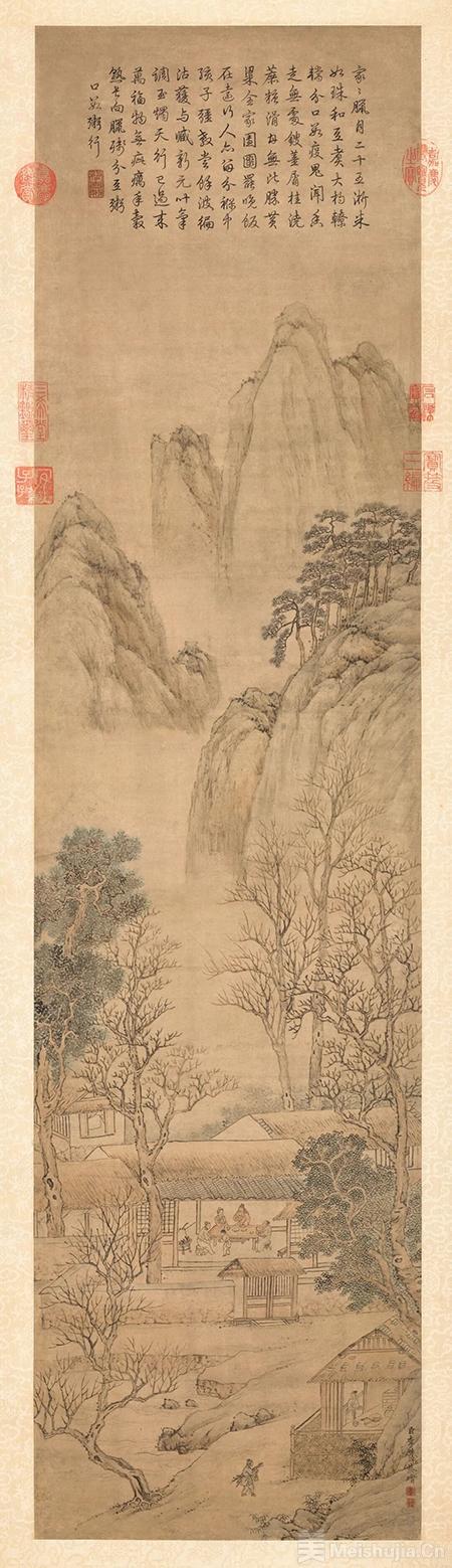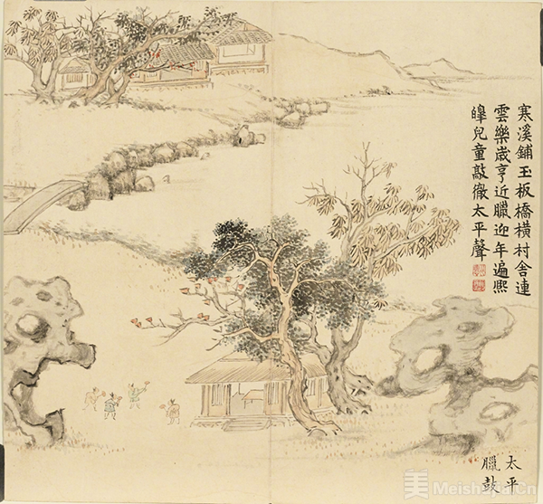 董诰以清雅笔墨铺陈景致,淡墨染就的寒溪与挂霜的古树点明节令,孩童的灵动与村舍的静谧相映成趣。没有繁复雕琢,却以极简的构图,将欢乐的氛围渲染得淋漓尽致,让腊月的烟火气与对新春的憧憬在笔墨间流转。