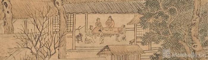 身为技艺全面的宫廷画家,李世倬在这幅画里特意褪去了宫廷工丽感,尽显市井生活的朴素本真。画面中,农家的日常鲜活生动:茅舍内,老少围坐于矮桌旁食粥,陈设简单却暖意融融。不远处的厨房里,一个妇人正在灶前准备餐食。屋外的土路上,男子抱着刚拾来的柴火匆匆走向灶台……画面满满的烟火气。背景里,松柏枝干枯劲如铁,杂木枝条峭利似剑,画家以苍秀的笔墨勾勒出隆冬的清寒,却恰恰衬得前景里粥碗的温热、家人围坐的暖意愈发动人。