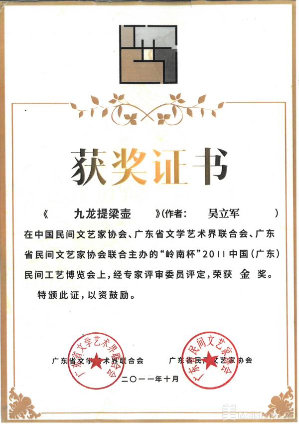 在由中国民间文艺家协会、广东省文学艺术联合会、广东省民间文艺家协会联合主办的“岭南杯”2011中国(广东)民间工艺博览会上,宜兴紫砂艺术家吴立军创作的《九龙提梁壶》,凭借精湛工艺与独特艺术神韵,经专家团严格评定,荣获本届博览会金奖。