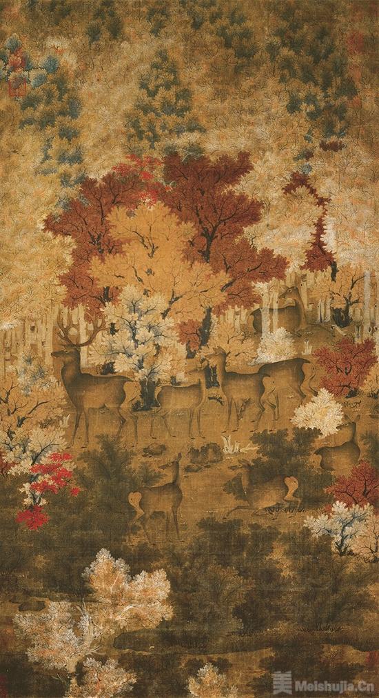 厘米、横64.6厘米,无作者名款,绢本设色,画面捕捉了色彩斑斓的树丛中鹿群动静相宜的生动场景。图中钤印元内府“奎章”“天历”二长方朱文半印,印证该画在14世纪前半叶曾入藏元代内府。旧题于五代,图内押有乾隆、嘉庆皇帝诸玺,裱边印有清初收藏家阿尔喜普等人的藏印,后为清宫藏品,入编《石渠宝笈初编》《故宫书画录》卷五等著录,现藏于台北故宫博物院。