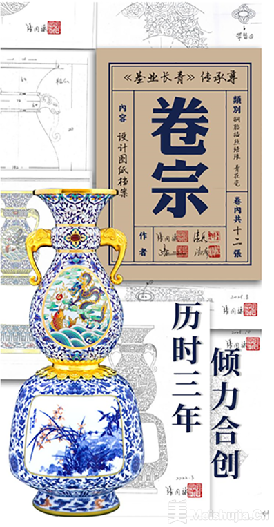 该作品由景泰蓝世家“张氏珐琅”张同䘵、张旭;青花瓷世家“陆氏青花”陆如、陆涛,两大世家、四位大师跨界联手打造,是中国工艺美术大师张同禄“世家传承”之作,是陆氏陶瓷跨界景泰蓝之作,是中国工艺美术领域“双世家传承”作品。